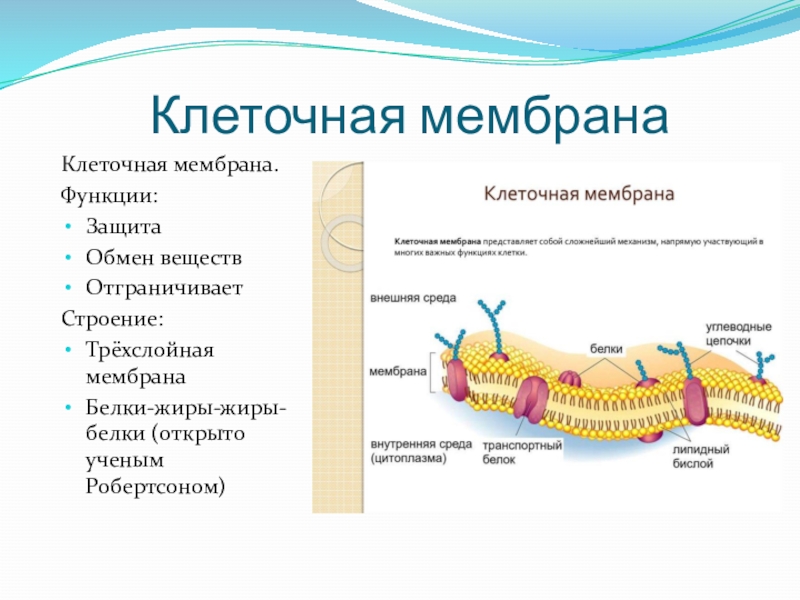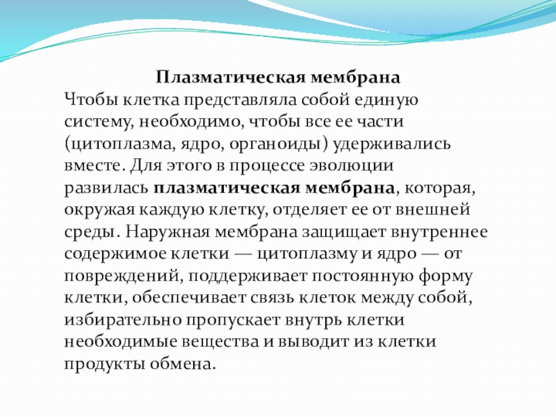 части (цитоплазма, ядро, органоиды) удерживались вместе. Для этого в процессе эволюции развилась плазматическая мембрана, которая, окружая каждую клетку, отделяет ее от внешней среды. Наружная мембрана защищает внутреннее содержимое клетки — цитоплазму и ядро — от повреждений, поддерживает постоянную форму клетки, обеспечивает связь клеток между собой, избирательно пропускает внутрь клетки необходимые вещества и выводит из клетки продукты обмена.