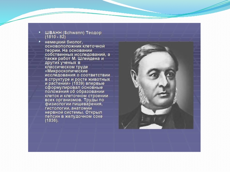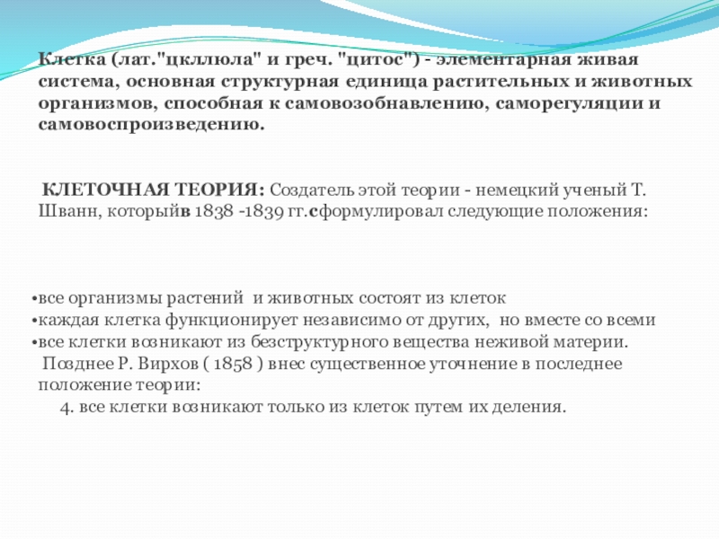 КЛЕТОЧНАЯ ТЕОРИЯ: Создатель этой теории - немецкий ученый Т. Шванн, которыйв 1838 -1839 гг.сформулировал следующие положения: