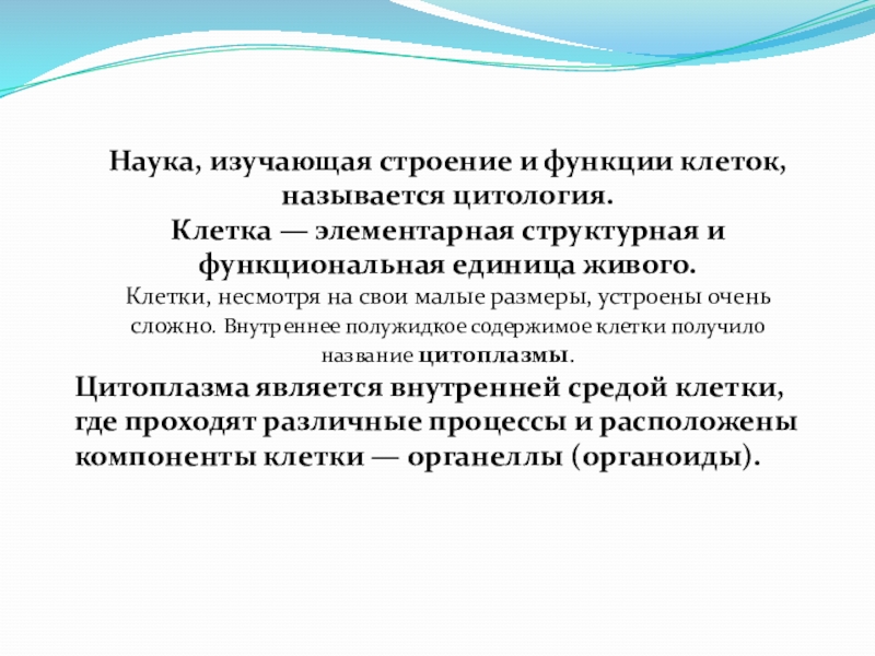Клетки, несмотря на свои малые размеры, устроены очень сложно. Внутреннее полужидкое содержимое клетки получило название цитоплазмы.