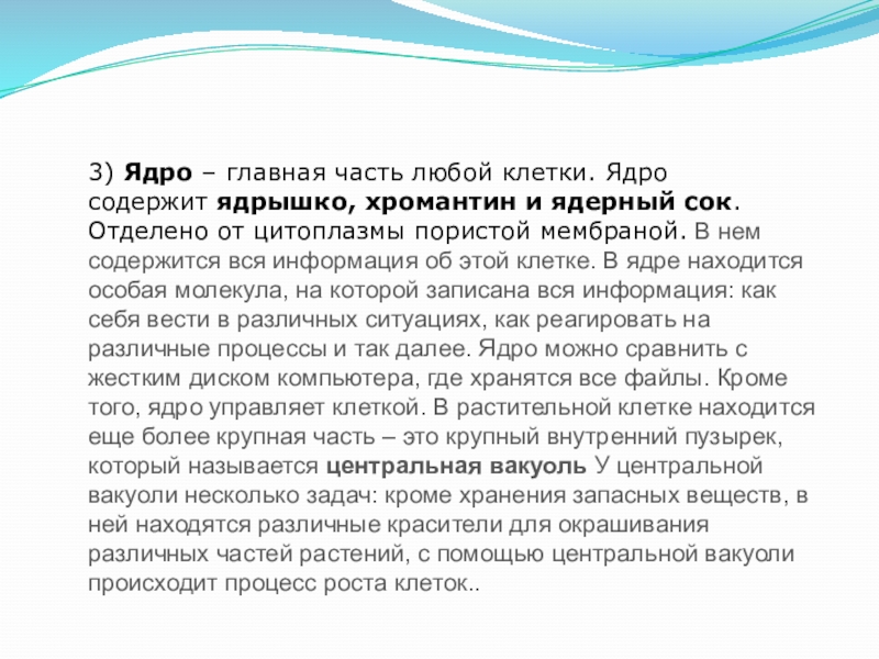 Отделено от цитоплазмы пористой мембраной. В нем содержится вся информация об этой клетке. В ядре находится особая молекула, на которой записана вся информация: как себя вести в различных ситуациях, как реагировать на различные процессы и так далее. Ядро можно сравнить с жестким диском компьютера, где хранятся все файлы. Кроме того, ядро управляет клеткой. В растительной клетке находится еще более крупная часть – это крупный внутренний пузырек, который называется центральная вакуоль У центральной вакуоли несколько задач: кроме хранения запасных веществ, в ней находятся различные красители для окрашивания различных частей растений, с помощью центральной вакуоли происходит процесс роста клеток..