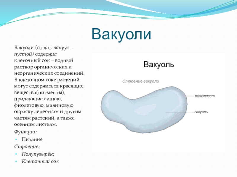 Вакуоли (от лат. вакуус – пустой) содержат клеточный сок – водный