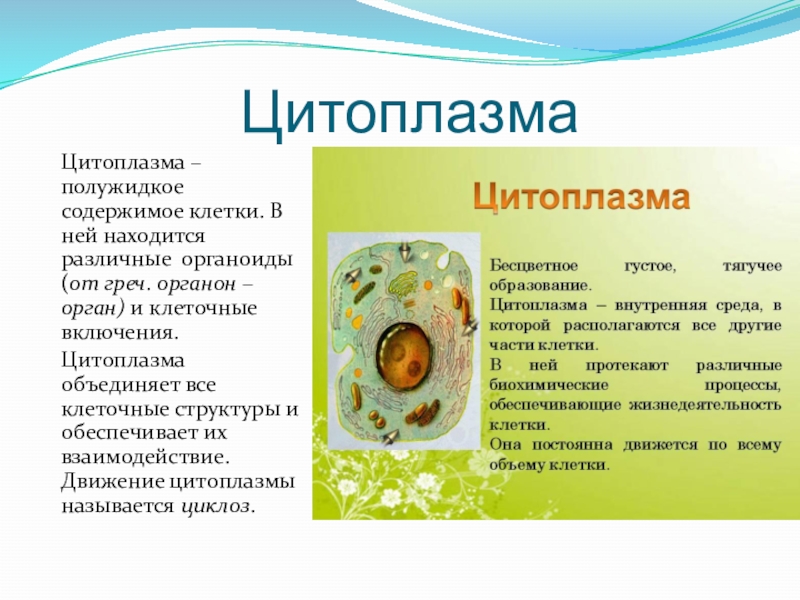 Цитоплазма – полужидкое содержимое клетки. В ней находится различные органоиды (от