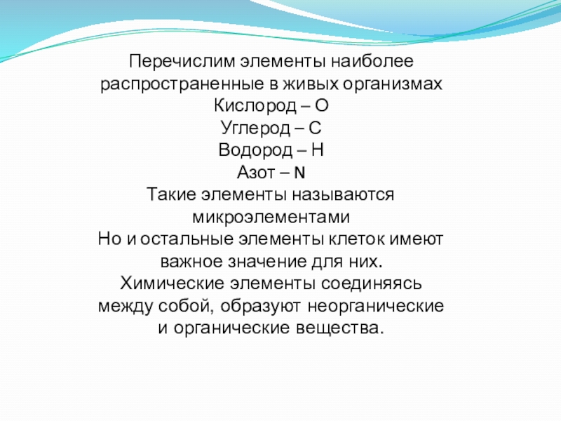 Слайд 11Перечислим элементы наиболее распространенные в живых организмах