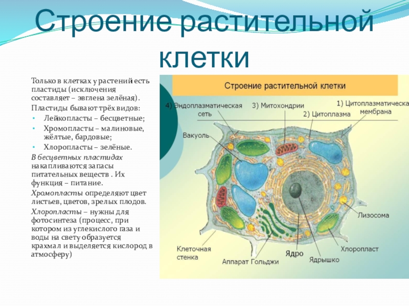 Хлоропласты – нужны для фотосинтеза (процесс, при котором из углекислого газа и воды на свету образуется крахмал и выделяется кислород в атмосферу)
