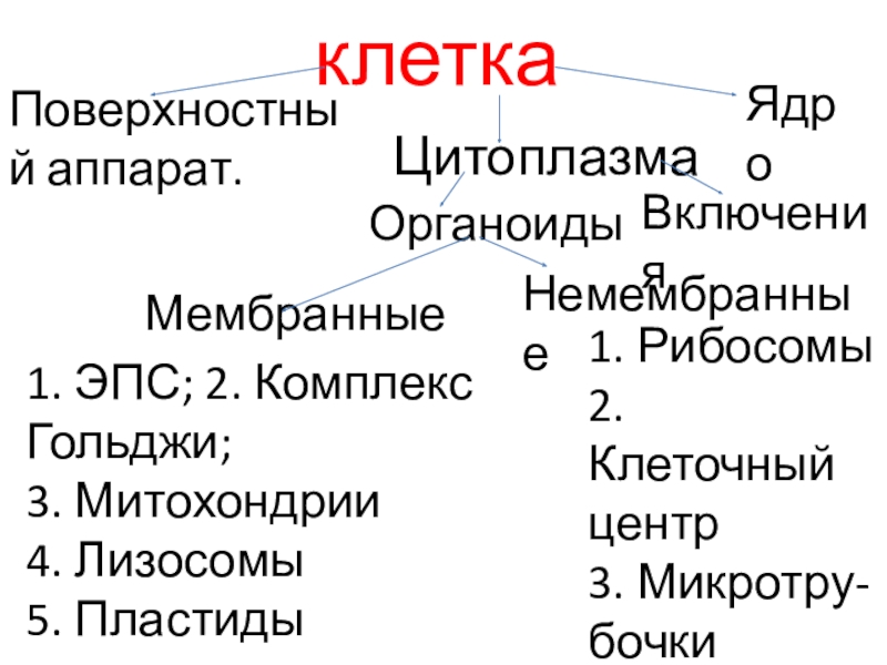 клеткаПоверхностный аппарат.ЯдроЦитоплазмаВключенияОрганоидыМембранныеНемембранные1. Рибосомы 2. Клеточный центр 3. Микротру-бочки1. ЭПС; 2. Комплекс Гольджи; 3. Митохондрии 4. Лизосомы