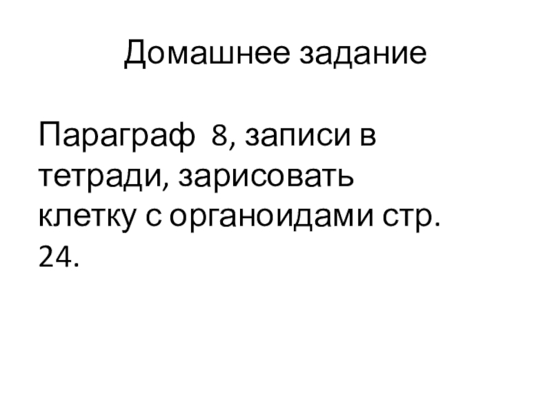Домашнее заданиеПараграф 8, записи в тетради, зарисовать клетку с органоидами стр. 24.