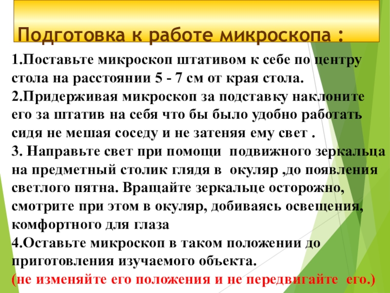 Изготавливая препараты для рассматривания их под микроскопом, осторожно брать покровное стекло большим и указательным пальцами за края и аккуратно опускать на предметное стекло, чтобы оно свободно легло на препарат.
