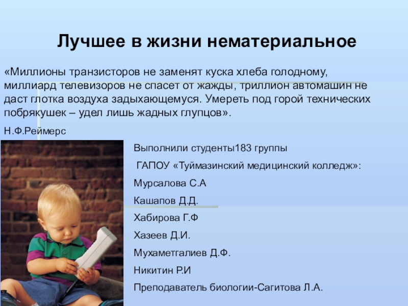 «Миллионы транзисторов не заменят куска хлеба голодному, миллиард телевизоров не спасет от жажды, триллион автомашин не даст глотка воздуха задыхающемуся. Умереть под горой технических побрякушек – удел лишь жадных глупцов».
