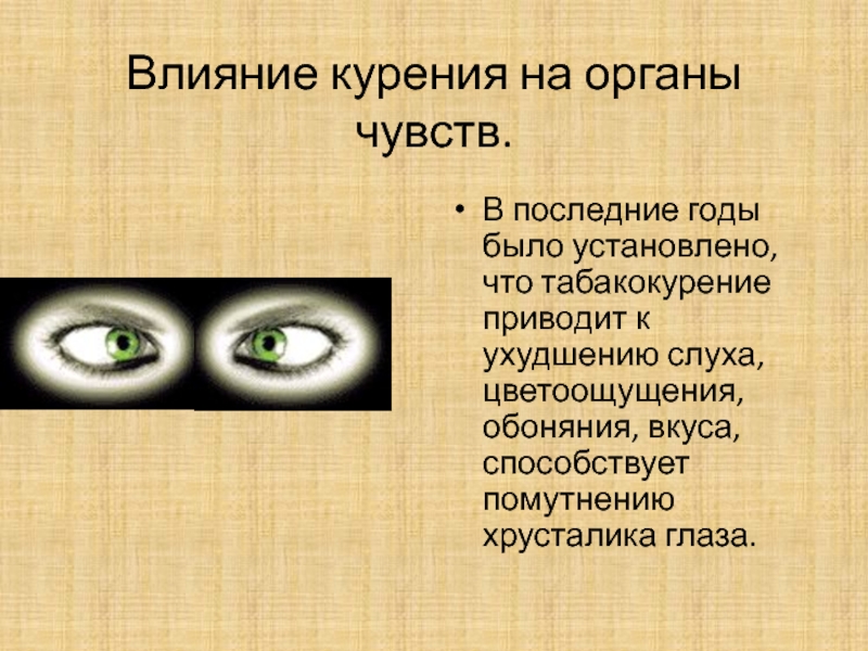 приводит к ухудшению слуха, цветоощущения, обоняния, вкуса, способствует помутнению хрусталика глаза.