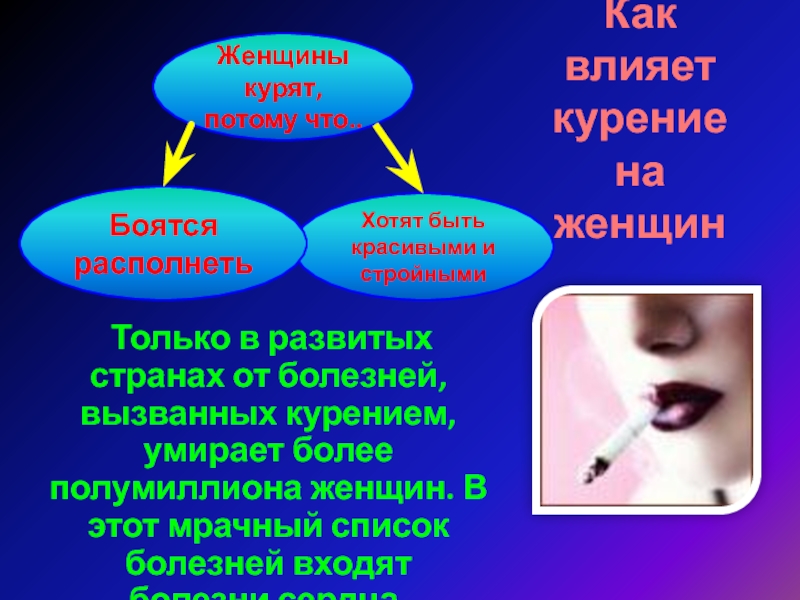 вызванных курением, умирает более полумиллиона женщин. В этот мрачный список болезней входят