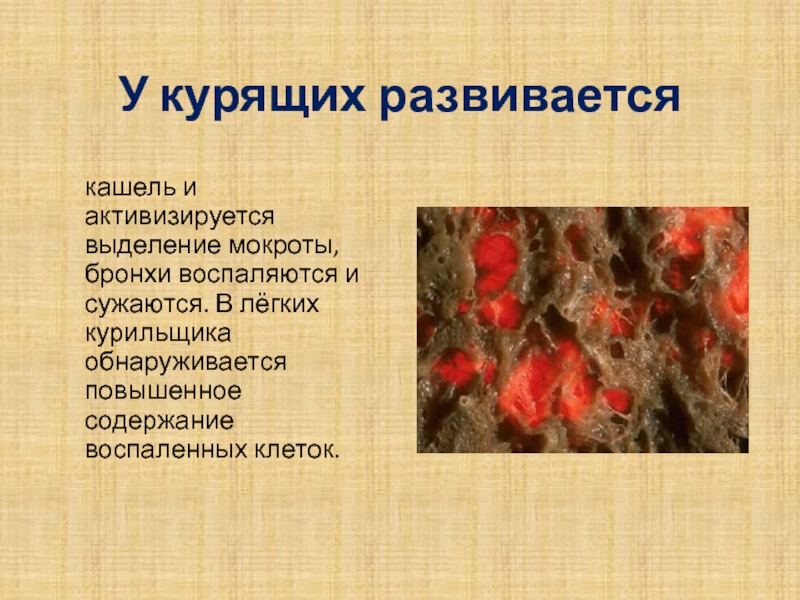 воспаляются и сужаются. В лёгких курильщика обнаруживается повышенное содержание воспаленных клеток.