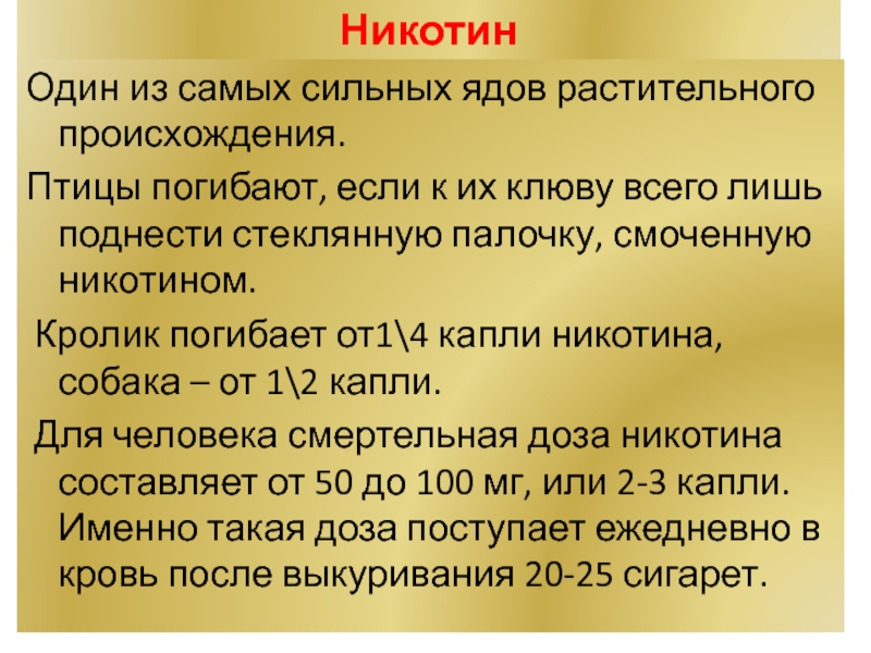Для человека смертельная доза никотина составляет от 50 до 100 мг, или 2-3 капли. Именно такая доза поступает ежедневно в кровь после выкуривания 20-25 сигарет.