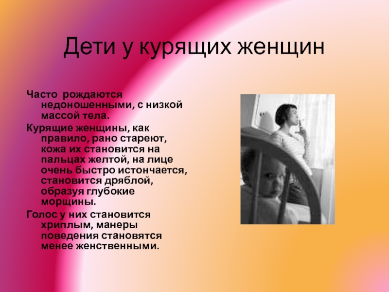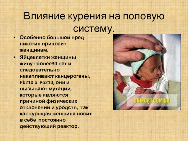 живут более30 лет и следовательно накапливают канцерогены, Pb210 b Po210, они и вызывают мутации, которые являются причиной физических отклонений и уродств, так как курящая женщина носит в себе постоянно действующий реактор.