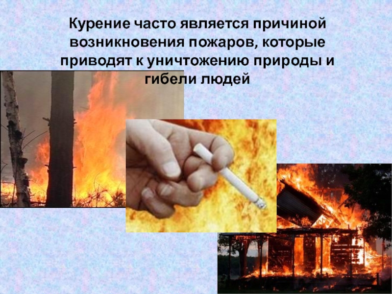 Слайд 39Курение часто является причиной возникновения пожаров, которые приводят к уничтожению природы