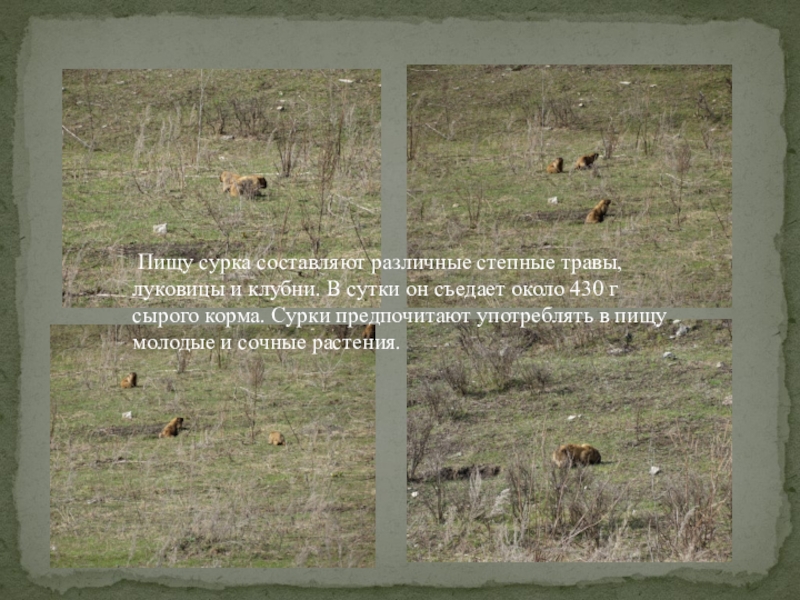 Активны сурки весной, когда много корма, богатого не только питательными веществами, но и водой (зеленой травы). В это время у них рождаются детеныши.