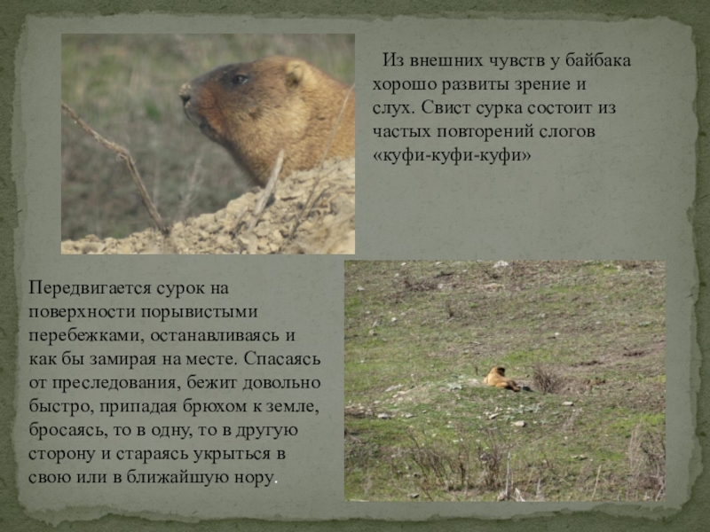 Передвигается сурок на поверхности порывистыми перебежками, останавливаясь и как бы замирая на месте. Спасаясь от преследования, бежит довольно быстро, припадая брюхом к земле, бросаясь, то в одну, то в другую сторону и стараясь укрыться в свою или в ближайшую нору.