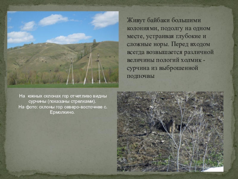 На южных склонах гор отчетливо видны сурчины (показаны стрелками).