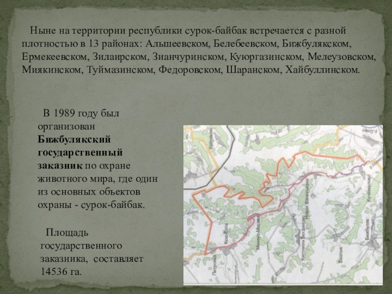 В 1989 году был организован Бижбулякский государственный заказник по охране животного мира, где один из основных объектов охраны - сурок-байбак.