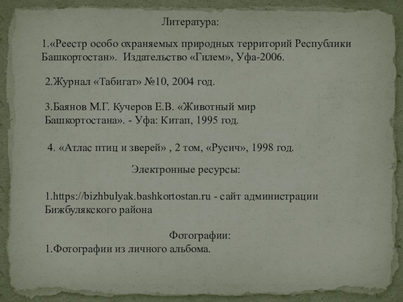3.Баянов М.Г. Кучеров Е.В. «Животный мир Башкортостана». - Уфа: Китап, 1995 год.