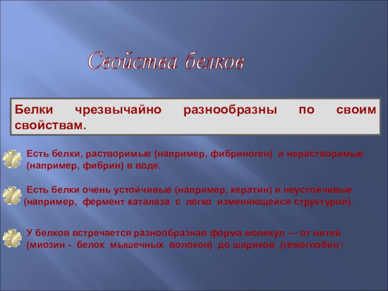 У белков встречается разнообразная форма молекул — от нитей (миозин - белок мышечных волокон) до шариков (гемоглобин)