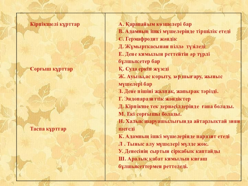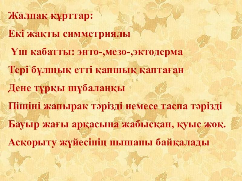 Слайд 1Жалпақ құрттар типіне жататын жәндіктердің негізгі ерекшеліктері