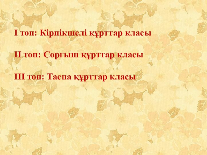 І топ: Кірпікшелі құрттар класыІІ топ: Сорғыш құрттар класы ІІІ топ: Таспа құрттар класы