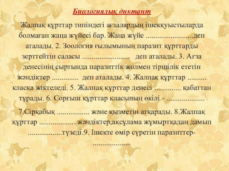 Биологиялық диктантЖалпақ құрттар типіндегі ағзалардың ішекқуыстыларда болмаған жаңа жүйесі бар. Жаңа жүйе .........................деп аталады. 2. Зоология ғылымының
