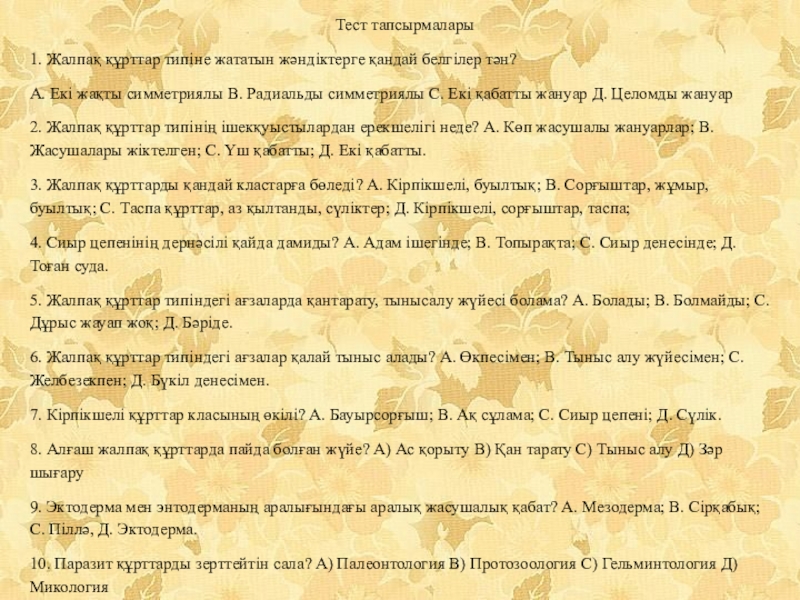 Тест тапсырмалары1. Жалпақ құрттар типіне жататын жәндіктерге қандай белгілер тән? А. Екі жақты симметриялы В. Радиальды симметриялы
