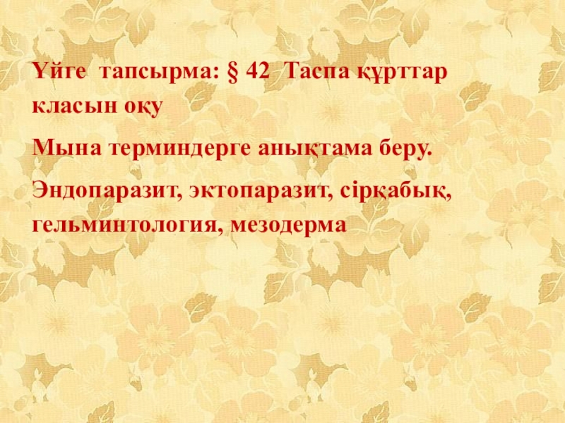 Слайд 9Үйге тапсырма: § 42 Таспа құрттар класын оқу