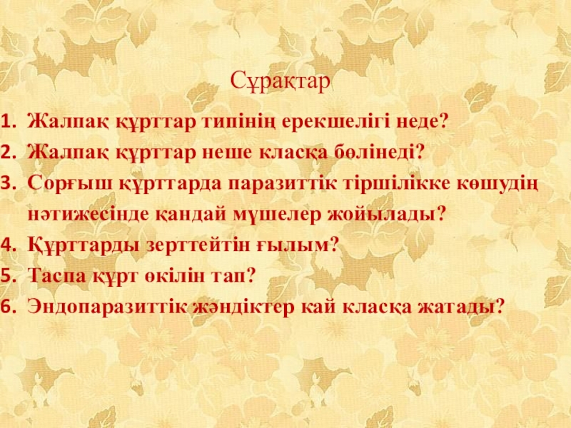 СұрақтарЖалпақ құрттар типінің ерекшелігі неде?Жалпақ құрттар неше класқа бөлінеді?Сорғыш құрттарда паразиттік тіршілікке көшудің нәтижесінде қандай мүшелер