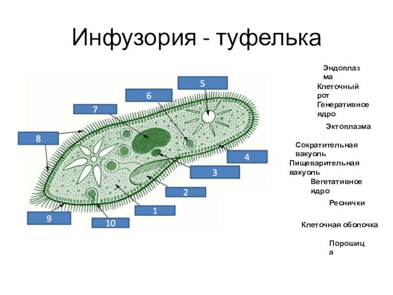 Инфузория - туфелькаЭндоплазмаКлеточный ротГенеративное ядроЭктоплазмаСократительная вакуольПищеварительная вакуольВегетативное ядроРесничкиКлеточная оболочкаПорошица12345678910