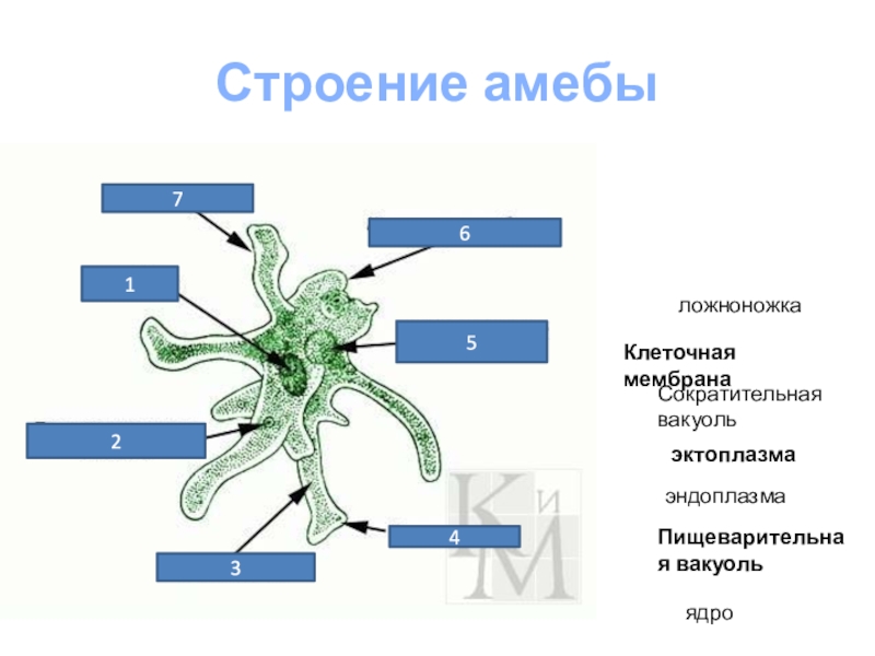 Строение амебыядроПищеварительная вакуольэндоплазмаэктоплазмаСократительная вакуольКлеточная мембраналожноножка1234567