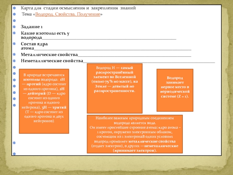 Он имеет простейшее строение атома: ядро атома – 1 протон, окружено электронным облаком, состоящим из 1 электронаВ одних условиях водород проявляет металлические свойства (отдает электрон), в других —неметаллические (принимает электрон).