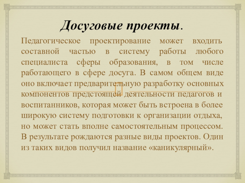 специалиста сферы образования, в том числе работающего в сфере досуга. В самом общем виде оно включает предварительную разработку основных компонентов предстоящей деятельности педагогов и воспитанников, которая может быть встроена в более широкую систему подготовки к организации отдыха, но может стать вполне самостоятельным процессом. В результате рождаются разные виды проектов. Один из таких видов получил название «каникулярный».
