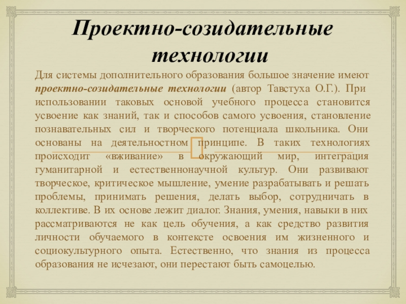 Тавстуха О.Г.). При использовании таковых основой учебного процесса становится усвоение как знаний, так и способов самого усвоения, становление познавательных сил и творческого потенциала школьника. Они основаны на деятельностном принципе. В таких технологиях происходит «вживание» в окружающий мир, интеграция гуманитарной и естественнонаучной культур. Они развивают творческое, критическое мышление, умение разрабатывать и решать проблемы, принимать решения, делать выбор, сотрудничать в коллективе. В их основе лежит диалог. Знания, умения, навыки в них рассматриваются не как цель обучения, а как средство развития личности обучаемого в контексте освоения им жизненного и социокультурного опыта. Естественно, что знания из процесса образования не исчезают, они перестают быть самоцелью.