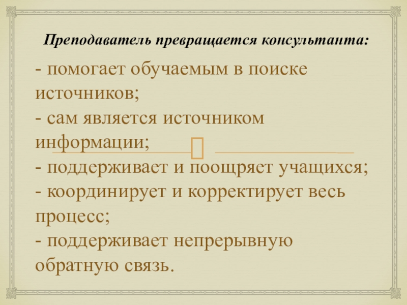 2) качественно меняется роль педагога: устраняется его доминирующая роль в процессе присвоения знаний и опыта, ему приходится не только и не столько учить, сколько помогать ребенку учиться, направлять его познавательную деятельность.