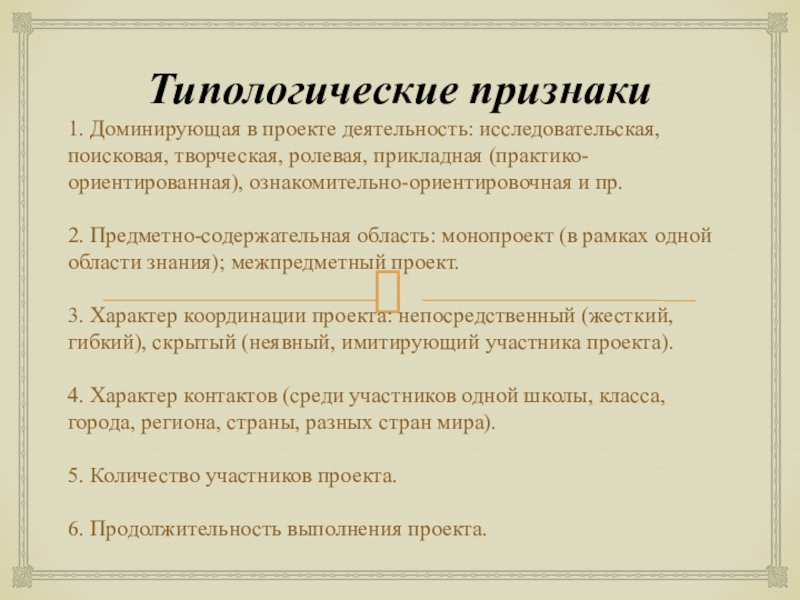 1. Доминирующая в проекте деятельность: исследовательская, поисковая, творческая, ролевая, прикладная