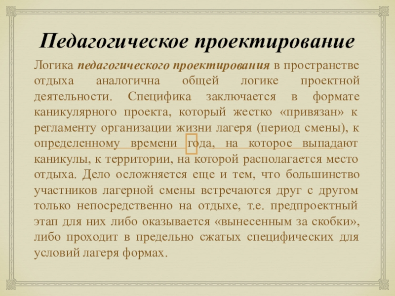 Логика педагогического проектирования в пространстве отдыха аналогична общей логике проектной