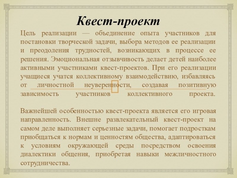 Важнейшей особенностью квест-проекта является его игровая направленность. Внешне развлекательный квест-проект на самом деле выполняет серьезные задачи, помогает подросткам приобщаться к нормам и ценностям общества, адаптироваться к условиям окружающей среды посредством освоения диалектики общения, приобретая навыки межличностного сотрудничества.