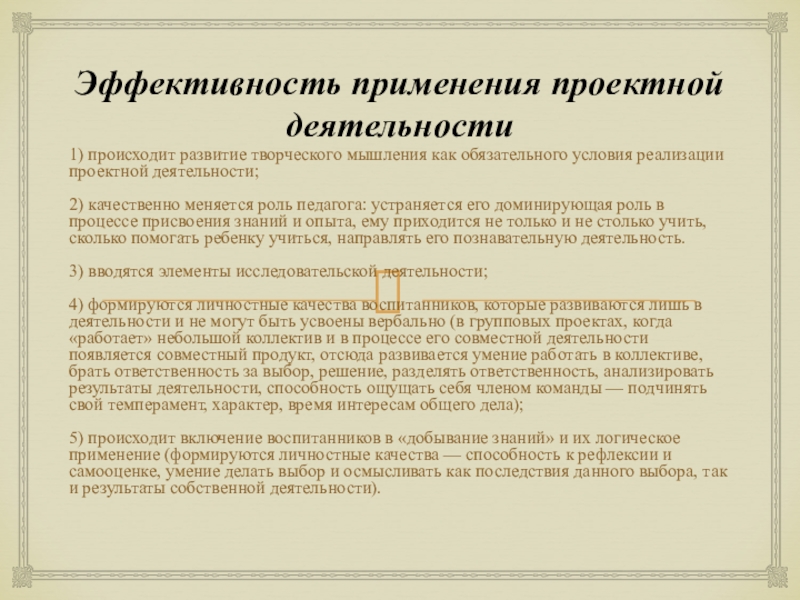 5) происходит включение воспитанников в «добывание знаний» и их логическое применение (формируются личностные качества — способность к рефлексии и самооценке, умение делать выбор и осмысливать как последствия данного выбора, так и результаты собственной деятельности).