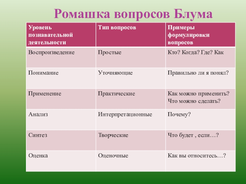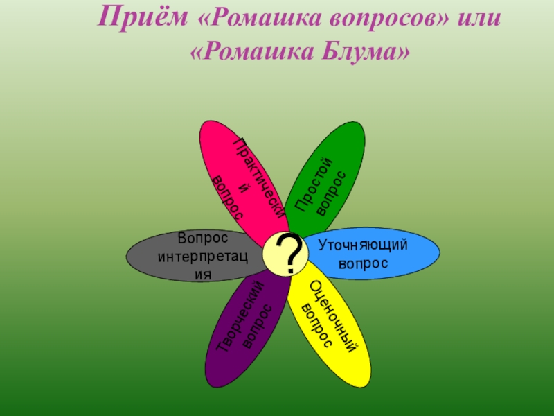 Приём «Ромашка вопросов» или «Ромашка Блума»Простой вопросУточняющий вопросОценочный вопросТворческий вопросВопрос интерпретацияПрактический вопрос?