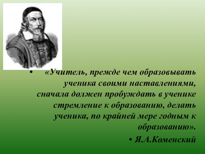 «Учитель, прежде чем образовывать ученика своими наставлениями, сначала должен пробуждать в ученике стремление к образованию, делать ученика, по крайней мере годным к образованию».Я.А.Коменский