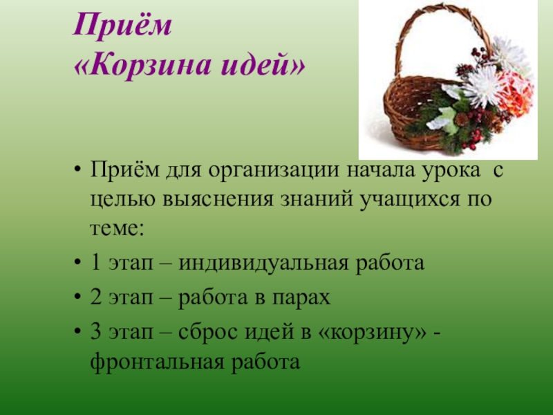 Приём  «Корзина идей»Приём для организации начала урока с целью выяснения знаний учащихся по теме:1 этап –