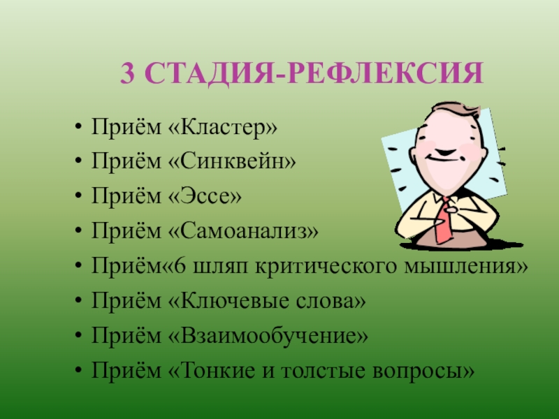 3 СТАДИЯ-РЕФЛЕКСИЯПриём «Кластер»Приём «Синквейн»Приём «Эссе»Приём «Самоанализ»Приём«6 шляп критического мышления»Приём «Ключевые слова»Приём «Взаимообучение»Приём «Тонкие и толстые вопросы»