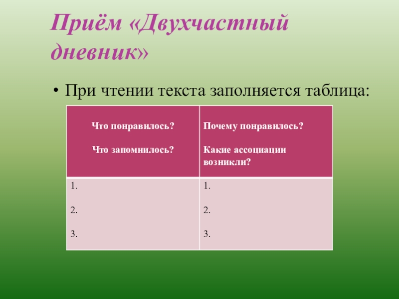 Приём «Двухчастный дневник»При чтении текста заполняется таблица: