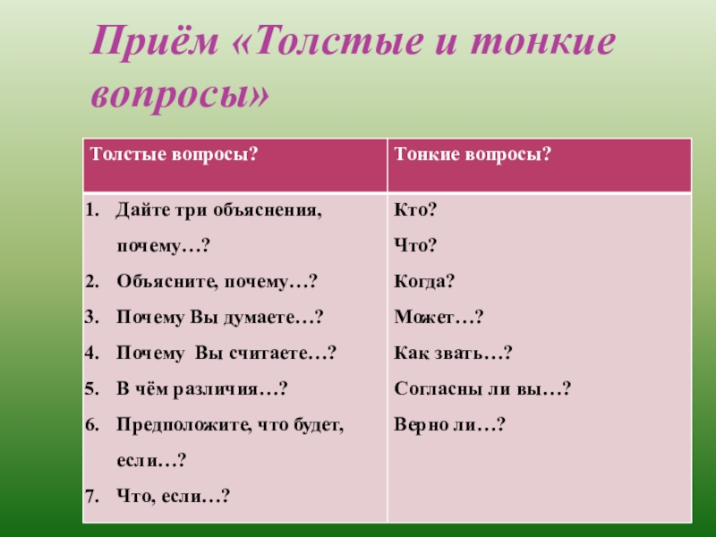Слайд 14Приём «Толстые и тонкие вопросы»