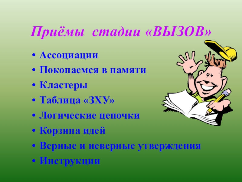 Приёмы стадии «ВЫЗОВ»АссоциацииПокопаемся в памятиКластерыТаблица «ЗХУ»Логические цепочкиКорзина идейВерные и неверные утвержденияИнструкции