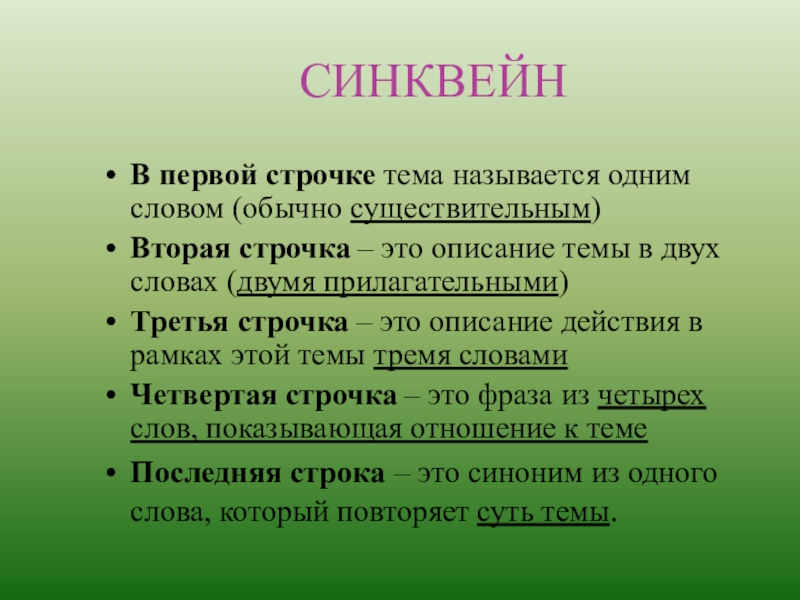 СИНКВЕЙНВ первой строчке тема называется одним словом (обычно существительным)Вторая строчка – это описание темы в двух словах