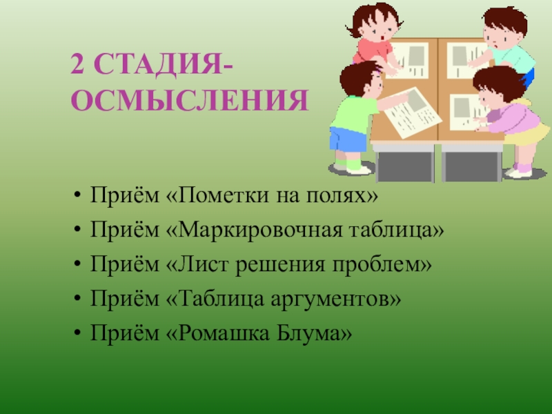 2 СТАДИЯ- ОСМЫСЛЕНИЯПриём «Пометки на полях»Приём «Маркировочная таблица»Приём «Лист решения проблем»Приём «Таблица аргументов»Приём «Ромашка Блума»