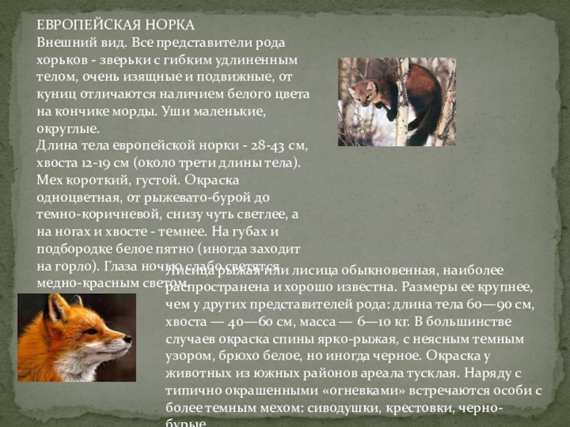 удлиненным телом, очень изящные и подвижные, от куниц отличаются наличием белого цвета на кончике морды. Уши маленькие, округлые.